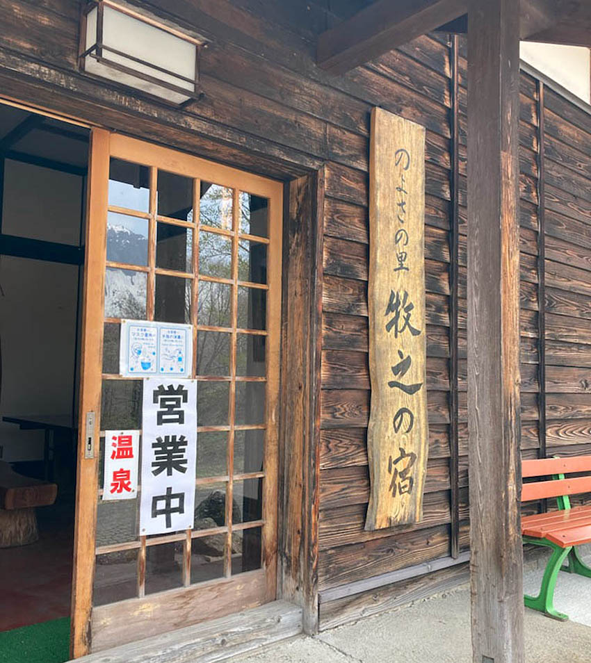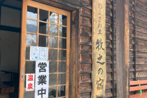 1軒宿の「のよさの里牧之の宿」は、江戸時代の暮らしを再現した建物で、コテージ風の分家に宿泊できますが、日帰り入浴も可能です。秋山郷の大自然を活かした岩の露天風呂から、鳥甲山や秋の紅葉の眺望が素晴らしいです。