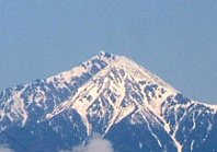 写真の常念岳にも、安曇野では常念坊さんという呑み助のお坊さんの雪型が見えるそうだが、松本からでは足のないおばけのような形が見えるだけで、よくわかりませんね。