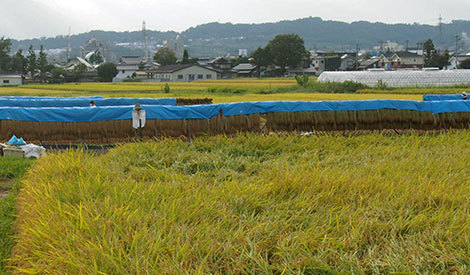 田んぼの隅で稲を守っていたのが、一家総出の稲刈りが終わると、はぜかけの稲木の前に移動して、乾燥中のお米を守っているのが面白いです。