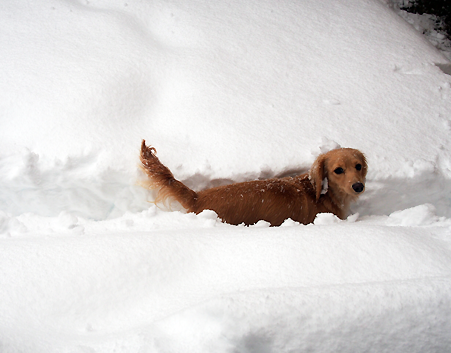 犬は喜び庭駆け回ろうとしたけど前に進めず、犬かきのように雪の中を泳ぎ、悪戦苦闘した末、立派な雪のトンネルを作りました。