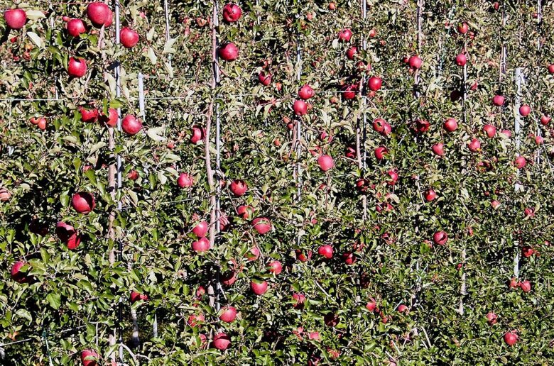 リンゴもブドウも、昔からのわい曲や棚で枝を水平に伸ばす日本的な栽培法から、枝を真っ直ぐ上に伸ばすヨーロッパのような栽培法に変わっていっているのがわかります。