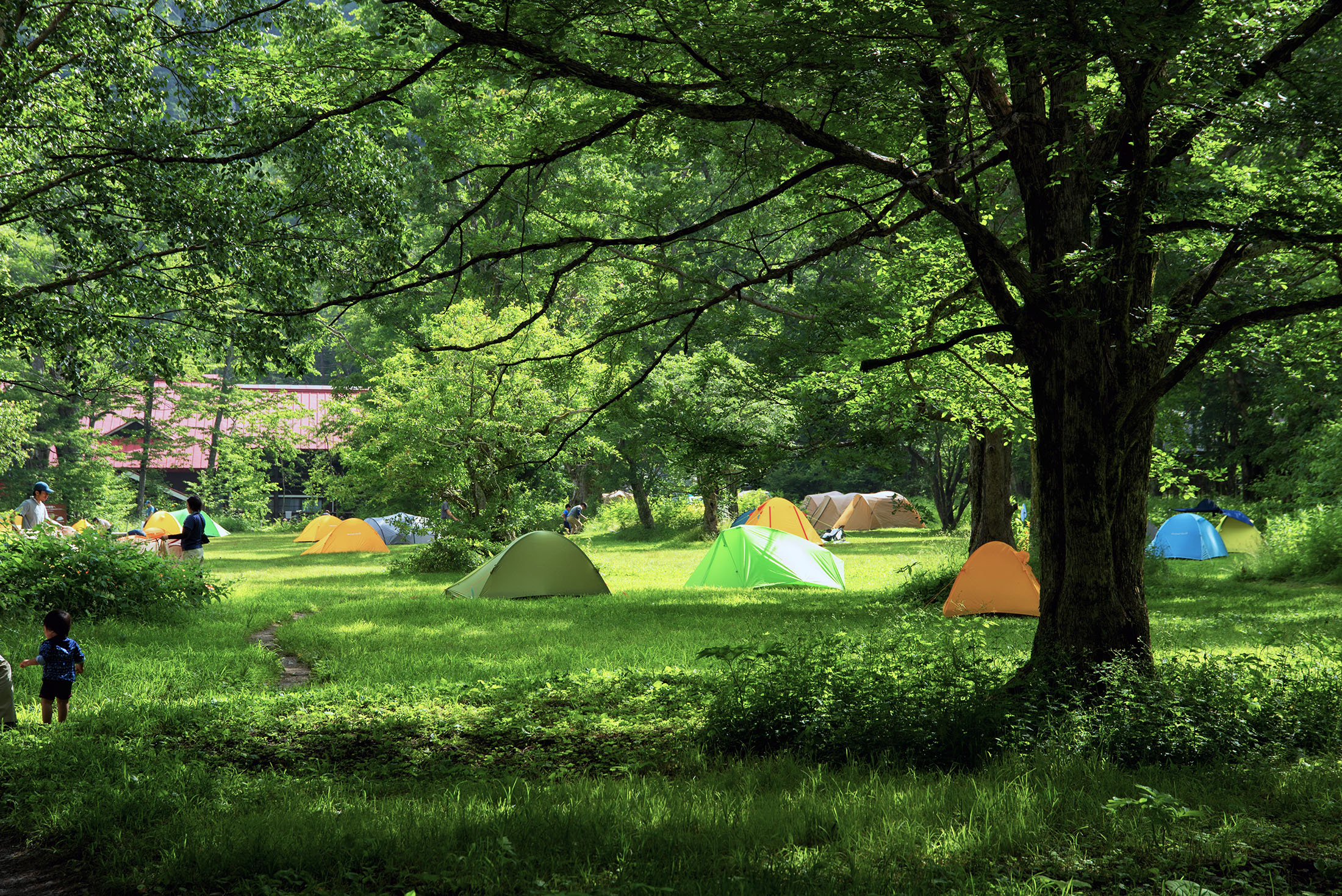 上高地の奥、5~6月にニリンソウが咲き、北アルプスへの登山基地の一つでもある徳沢にあります。宿の「徳澤園」が運営していて、大型の「ジオドーム」など各種テントのレンタル・「手ぶらでキャンプ」もできます。