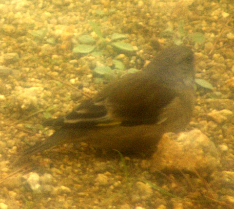 写真写りが悪いのは窓ガラス越しのためで、スミマセン。窓を少しでも開けると警戒して逃げていくので…。地面にいるのは、バードフィーダーから風でこぼれたエサを食べているからのようです。