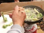 ガイドさんがおもむろに山用のコンロと天ぷら油をリュックから取り出し、山菜のコゴミを天ぷらにして、