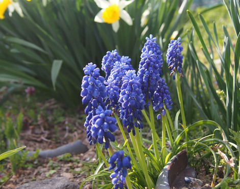 あぜ道ではムスカリと水仙、小道では満開の桜と咲き始めたハナモモが競演しています。