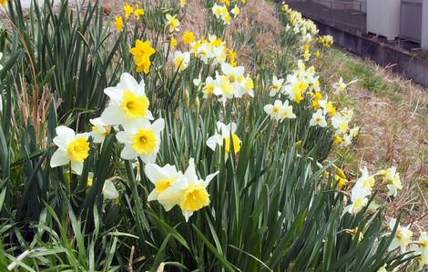 今年も近くの土手で、水仙が可憐な花を風になびかせながら咲いています。信州の「早春賦」の光景です。