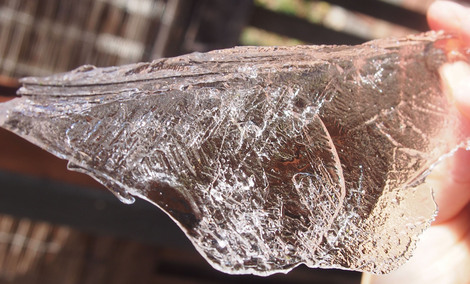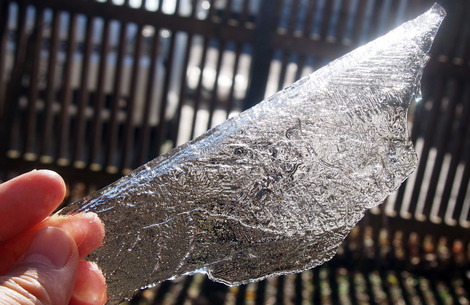 やっと履き替えようと冬のタイヤを出すと、タイヤの溝のせいか、くっついていた氷が美しい造形になっていました。