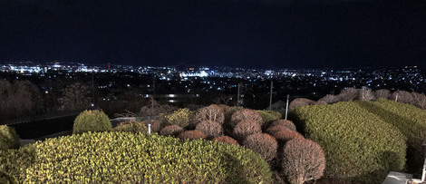 盆地の東側から松本平(盆地)の夜景と、その向こうに北アルプスを望みながら露天風呂や足湯に浸かれるという贅沢。