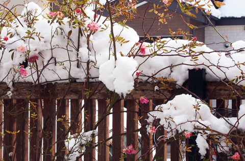 12月になっても咲いていた庭の薔薇は、その後も咲き続け、今週の雪で、雪中花となってます。
