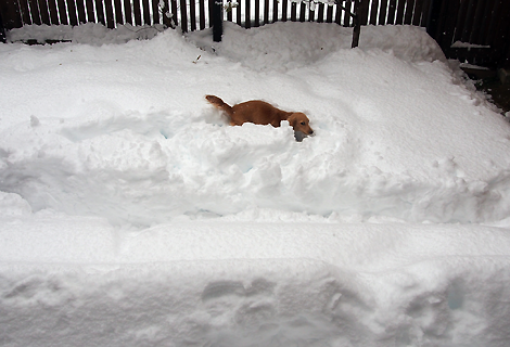 犬は喜び庭駆け回ろうとしたけど前に進めず、犬かきのように雪の中を泳ぎ、悪戦苦闘した末、立派な雪のトンネルを作りました。