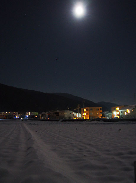 満月の月明かりの元、雪原と化した近くの田んぼを散歩した。