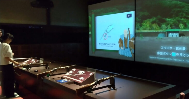「バーチャル砲術体験」で戦国時代の火縄銃と幕末のスペンサー銃の射的体験をしました。火縄銃を持って構えるのは初体験でしたが、重くて持っているのがやっと。