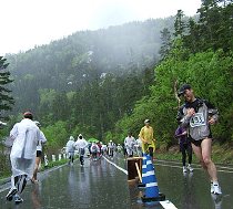 大雨で、走る道は両側が滝のようになって川のように水が流れている所もあり、本当に走れるのか、と思ったけど、写真のように900人の人がスタートし、ほとんどが完走された。