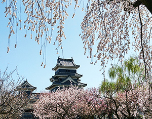 枝垂れ桜と梅の競演(3/29 松本城)2021.03.29やっぱり早い今年の桜。でもまだ開花したばかりです