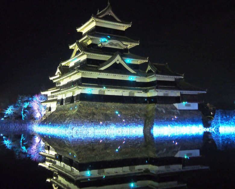 松本城レーザープロジェクションマッピング2021.12.10松本城でプロジェクションマッピング初開催。善光寺・軽井沢の恒例のイルミネーションも開催中♪