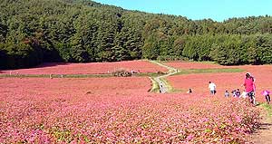 そんな時期にちょうど見頃を迎えるのが蕎麦の花とコスモス。蕎麦は、信州のあちこちで白い花畑が見られますが、花がピンク色の品種の「赤蕎麦」はご覧になったことがありますか? 南信州箕輪町の赤そばの里などで見られます。